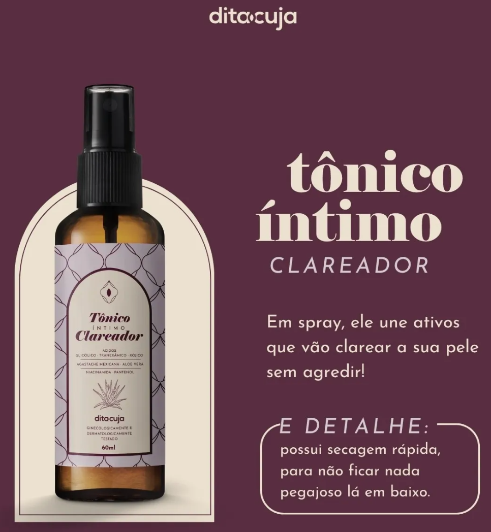 Composição Tônico Íntimo Clareador: Aqua (Water), Niacinamide, Tranexamic Acid, Propanediol, Glycolic Acid, Methyl Gluceth-20, Panthenol, Kojic Acid, Benzyl Alcohol, Glycerin, Sodium Citrate, Aloe Barbadensis Leaf Powder, Sodium Gluconate,Sodium Hydroxide, Benzoic Acid, Dehydroacetic Acid, Maltodextrin,Agastache MexicanaFlower/Leaf/Stem Extract.