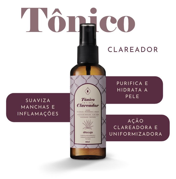 Composição Tônico Íntimo Clareador: Aqua (Water), Niacinamide, Tranexamic Acid, Propanediol, Glycolic Acid, Methyl Gluceth-20, Panthenol, Kojic Acid, Benzyl Alcohol, Glycerin, Sodium Citrate, Aloe Barbadensis Leaf Powder, Sodium Gluconate,Sodium Hydroxide, Benzoic Acid, Dehydroacetic Acid, Maltodextrin,Agastache MexicanaFlower/Leaf/Stem Extract.