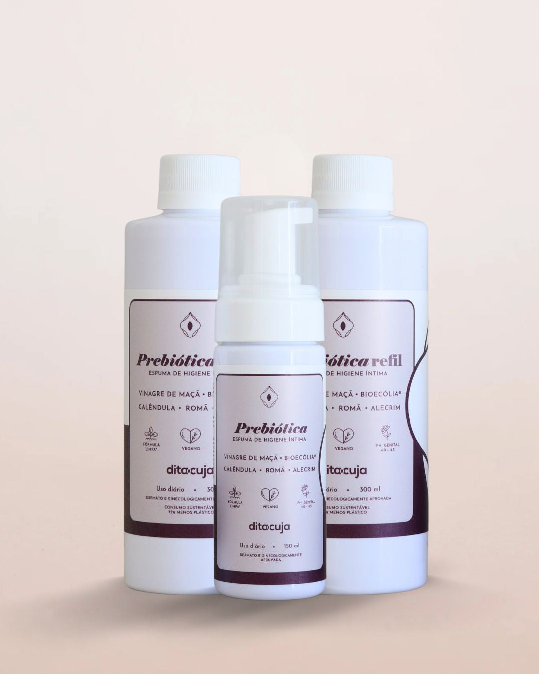 A Espuma Prebiótica Dita Cuja fortalece a microbiota, hidrata e protege a região íntima com ativos naturais, sem agredir o pH ou a barreira cutânea.