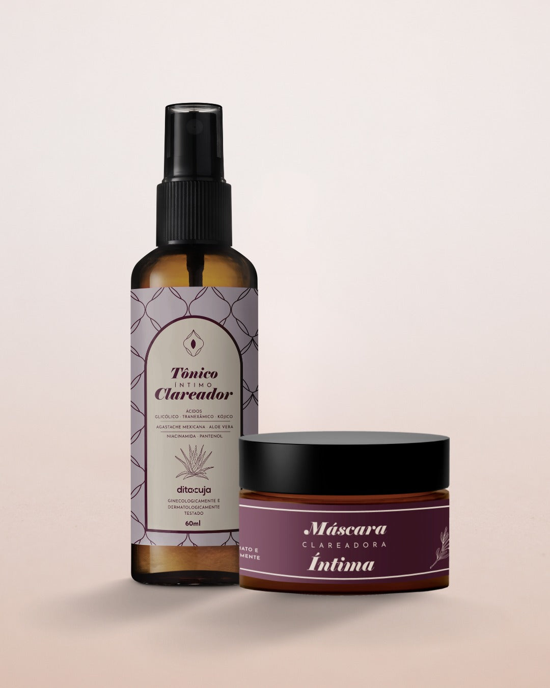 - Tônico Clareador: Com ácido tranexâmico, ácido glicólico, niacinamida e ácido kójico — ativos que uniformizam o tom da pele e estimulam a renovação celular.