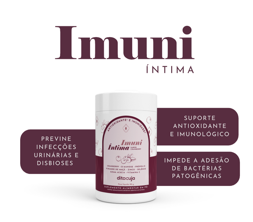 O Imuni Íntima é formulado com ativos naturais como Cranberry, Própolis, D-Manose, Vinagre de Maçã, Vitamina C, Selênio e Goma Acácia — combinação que fortalece a imunidade íntima, previne infecções e equilibra a microbiota.